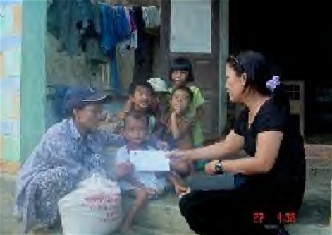 | His intestines empty into a bag he wears around his waist. He has a large tumor on his back and a club left foot. Here LOVE presents him rice and money for medical help. He will begin a series of operations over the next few years. |