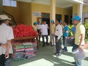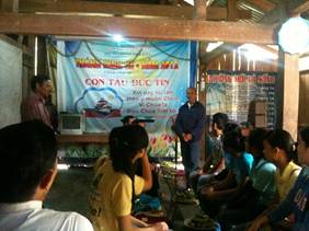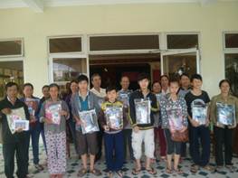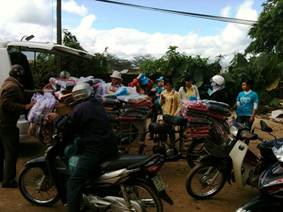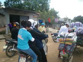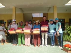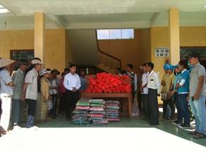 By My Dong: After about a 3-hour car travel and 20-minute drive by motorbike, we at last reached the 1st destination – the People Committee building of Tra Son commune. When we approached, many citizens were there waiting for us, so we quickly unloaded and got everything ready for distributing to them. Fifty Christmas gifts (each included one box of instant noodles, a blanket, a box of cooking oil, sugar, fish sauce and spice) were given out to the old, the poor, and needy here. |